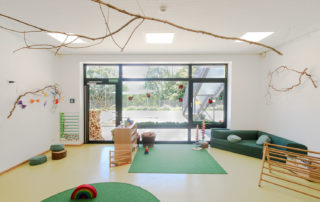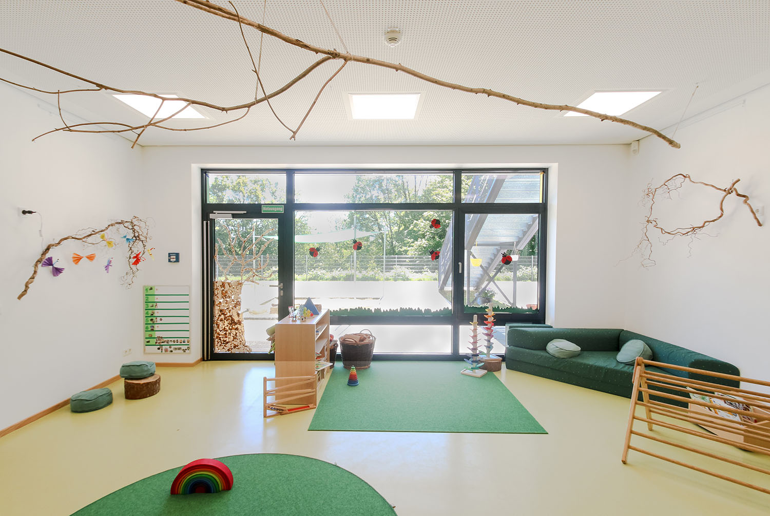 Die Grundrisszonierung des Gebäudes ist klar definiert und führt zu einer guten Orientierung für die Kinder. Großzügig dimensionierte Flurflächen führen dazu, dass diese als Spiel- und Begegnungsfläche genutzt werden.
